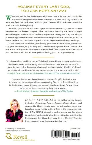 With an openhanded spirit and openhearted vulnerability, Leeana Tankersley reveals the darkest chapter of her own story, the thing she never thought would happen and could do nothing to prevent. Along the way she shares how waiting patiently in the darkness allowed something incredible to take root within her: a defiant and hard-won hope that is not dependent on happy endings.