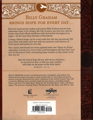 Beloved inspirational author and pastor Billy Graham understood the importance of hope. Having hope translates to living a life full of peace, joy, and love. God's Word overflows with hope throughout its pages–all the way from Genesis to Revelation. With Billy Graham's Hope for Each Day, that biblical hope can be yours every day.