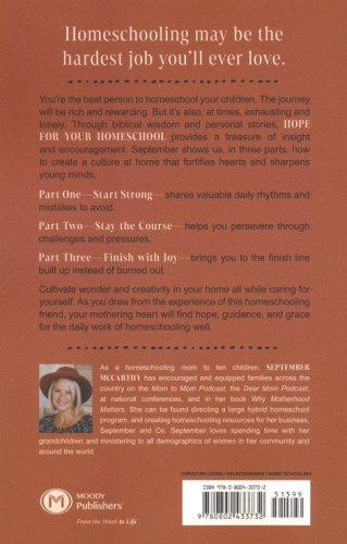 These are good thoughts and questions. It’s important to consider them and find answers. In Hope for Your Homeschool, September McCarthy—seasoned homeschooling mom of ten children and twelve grandchildren—addresses the fears and concerns that accompany homeschooling. And she provides a successful, well-tested plan! Through biblical insight and personal stories, September shows us how to create a culture at home that will fortify hearts and sharpen young minds. September gives us practical steps to follow and mistakes to avoid.