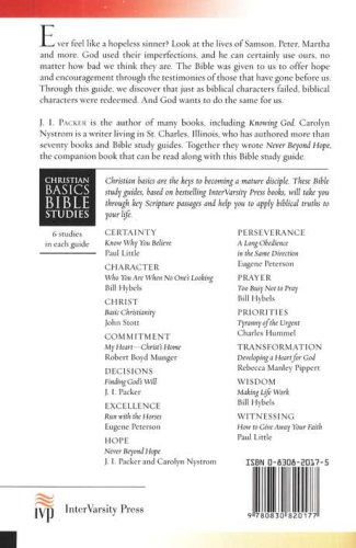 Ever feel like a hopeless sinner? Look at the lives of Samson, Peter and Martha. God used their imperfections, and he can certainly use yours–no matter how bad you think they are. The Bible offers hope and encouragement through the testimonies of those that have gone before you. In this Christian Basics Bible Study, based on relevant stories from the Bible and on Never Beyond Hope by J. I. Packer and Carolyn Nystrom, you'll discover that just as these men and women of Scripture failed, they were also redeemed by God. And God wants to do the same for you.