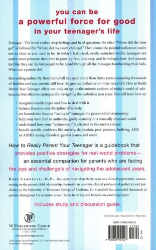 It's an MTV world, and teenagers are under more pressure than ever to grow up fast, look sexy, and be independent. Teens are bombarded with messages from the mainstream media at every turn. How to Really Parent Your Teenager provides an up-to-the-minute analysis of this tumultuous world of adolescence, outlining strategies for parents to be relevant and effective. Best-selling author Dr. Ross Campbell has spent more than 30 years studying the parent-child relationship and counseling thousands of parents. Into this rapidly changing culture he offers a guidebook of positive, proven strategies for real-world problems. Parents will learn how to spot depression and anticipate rebellion, how to discuss sexuality and keep anger in check, and most importantly, how to maintain communication and communicate love. Foreword by Dr. Gary Chapman.