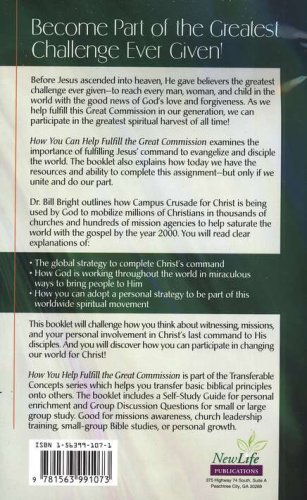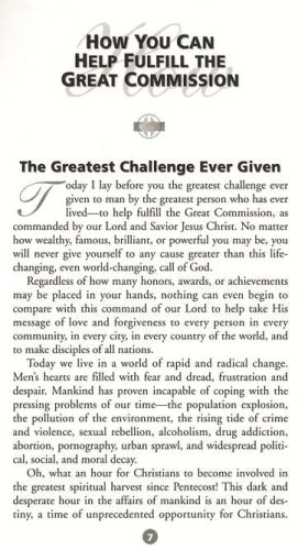 Before Jesus ascended into heaven, He gave believers the greatest challenge ever given – to reach every man, woman, and child in the world with the good news of God's love and forgivness. As we help fulfill this Great Commission in our generation, we can participate in the greatest spiritual harvest of all time. How You Can Help Fulfill the Great Commission examines the importance of fulfilling Jesus' command to evangelize and disciple the world. The booklet also explains how today we have the resources and ability to complete this assignment – but only if we unite and do our part.