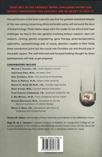 What will be the greatest moral challenge facing our society throughout this century? Are we ready to face it? Editors Charles W. Colson and Nigel M. de S. Cameron, along with a panel of expert contributors, make the case in this book that the greatest watershed debates of the twenty-first century concerning ethics and public policy will surround the issue of biotechnology. In twelve essays they address several of the legal and ethical challenges before us: embryo research, stem cell research, cloning, genetic engineering, gene therapy, pharmacogenomics, cybernetics, nanotechnology and, of course, abortion. Contributors include William L. Saunders, J. D., Family Research Council Christopher Hook, M.D., The Mayo Clinic Henk Jochemsen, Ph.D., Free University of Amsterdam David A. Prentice, Ph.D., Indiana State University Nathan A. Adams IV, Ph.D., J.D., Christian Legal Society David Stevens, M.D., Christian Medical Association Paige Comstock Cunningham, J. D., Americans United for Life C. Ben Mitchell, Ph.D., Trinity Evangelical Divinity School Richard Doerflinger, M.A., Secretariat for Pro-life, National Conference of Catholic Bishops Wesley J. Smith, J.D., International Task Force on Euthanasia and Assistend Suicide Leaders in their fields, these contributors point out the crucial role Christians can and should play in the public square. The well-informed and forward-looking perspectives they present will help us prepare for the challenges ahead.