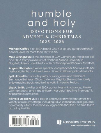 This devotional offers daily devotions for the first Sunday of Advent (November 30, 2025) through Epiphany (January 6, 2026). These devotions explore the humble and holy in year A scripture readings (in the Revised Common Lectionary) for Advent and Christmas, as well as for the festival days and commemorations in the Advent and Christmas seasons. The writers bring their unique voices and pastoral wisdom to these texts and offer the voices of other witnesses in the quotations they have chosen in the “To ponder” sections. The devotional also provides household blessings and prayers (see pages 81-93) to enrich your preparations and celebrations during the Advent and Christmas seasons.