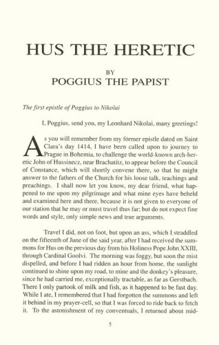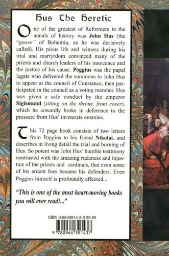 One of the greatest of Reformers in the annals of history was John Hus (the "goose" of Bohemia, as he was derisively called). His pious life and witness during his trial and martyrdom convinced many of the priests and church leaders of his innocence and the justice of his cause. Poggius was the papal legate who delivered the summons to John Hus to appear at the council of Constance, then participated in the council as a voting member. Hus was given a safe conduct by the emperor Sigismund which he cowardly broke in deference to the pressure from Hus' inveterate enemies. This 72 page book consists of two letters from Poggius to his friend Nikolai, and describes in living detail the trial and burning of Hus. So potent was John Hus' humble testimony contrasted with the amazing rudeness and injustice of the priests and cardinals, that even some of his ardent foes became his defenders. Even Poggius himself is profoundly affected.