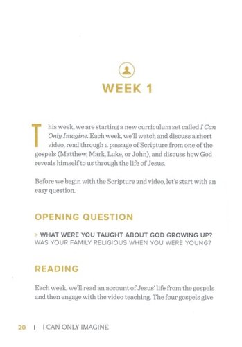 Many small group leaders feel ill-equipped to create a natural conversation that leads to a meaningful experience for their group members. This I Can Only Imagine Leader's Guide works in conjunction with the Video Series to equip group leaders with helpful tips on leading a group, thoughtful discussion questions for each week, and suggested scripture to read. Create a directed, safe, and open environment to lead your group through a redemptive transformation – from past brokenness to everlasting hope. 56 pages.