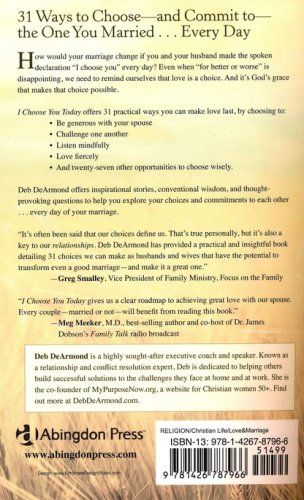 Married for nearly 38 years, author Deborah DeArmond and her husband have made the spoken declaration, "I choose you today" a regular part of their communication. It’s when we least feel like saying it that we need to remind ourselves that love is a choice, not a feeling. I Choose You Today features 31 scriptural principles that support marriage and help couples develop healthy biblically based behavior. Built on an introductory anecdotal story, each chapter has an inspirational takeaway of not only what to do, but how to begin applying the principles immediately. Thought provoking questions create talking points for couples to explore their own choices and experiences in each area serve to generate open dialogue of discovery. I Choose You Today is not a book of "shoulds," but one of clearly identified choices that each individual can make to grow their marriage and align it with the word of God. Every saying ends with a conventional wisdom quote.