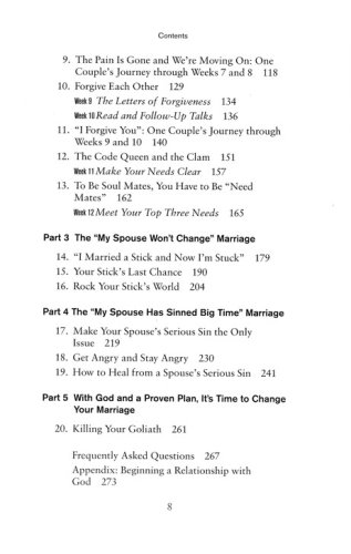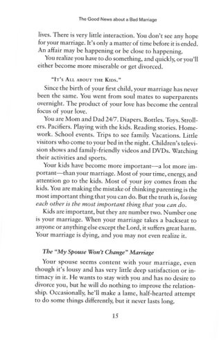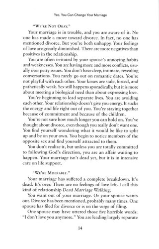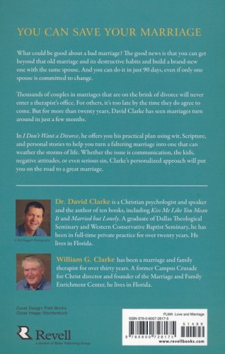 Thousands of couples in marriages that are on the brink of divorce will never enter a therapist's office. For others, it's too late by the time they do agree to come. But for more than twenty years, David Clarke has seen marriages turn around in just three months. In I Don't Want a Divorce, he takes his practical plan and presents it using wit, Scripture, and personal stories to help couples turn difficult marriages into great ones. Whether the issue is communication, the kids, negative attitudes, or even serious sin, Clarke's personalized approach will put readers on the road to a great marriage.