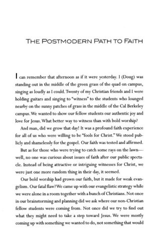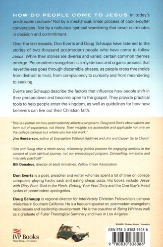 How do people come to Jesus in today's postmodern culture? Not by a mechanical, linear process of cookie cutter conversions. Nor by a nebulous spiritual wandering that never culminates in decision and commitment. Over the last decade, Don Everts and Doug Schaupp have listened to the stories of two thousand postmodern people who have come to follow Jesus. While their stories are diverse and varied, certain common themes emerge. Postmodern evangelism is a mysterious and organic process that nevertheless goes through discernible phases, as people cross thresholds from distrust to trust, from complacency to curiosity and from meandering to seeking. Everts and Schaupp describe the factors that influence how people shift in their perspectives and become open to the Gospel. They provide practical tools to help people enter the kingdom, as well as guidelines for how new believers can live out their Christian faith.