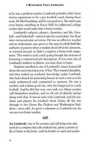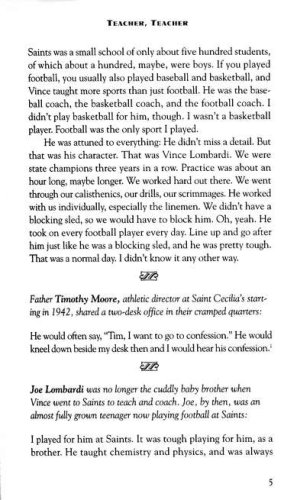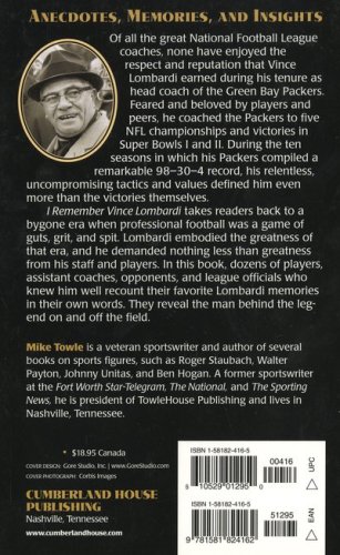 Of all the great National Football League coaches, none have enjoyed the respect and reputation that Vince Lombardi earned during his tenure as head coach of the Green Bay Packers. Feared and beloved by players and peers, he coached the Packers to five NFL championships and victories in Super Bowls I and II. During the ten seasons in which his Packers compiled a remarkable 98-30-4 record, his relentless, uncompromising tactics and values defined him even more than the victories themselves. This book takes readers back to a bygone era when professional football was a game of guts, grit, and spit. Lombardi embodied the greatness of that era, and he demanded nothing less than greatness from his staff and players. In this book, dozens of players, assistant coaches, opponents, and league officials who knew him well recount their favorite Lombardi memories in their own words. They reveal the man behind the legend on and off the field.