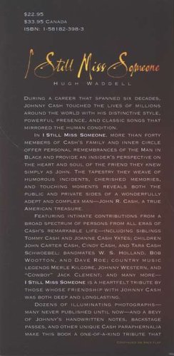 During a career that spanned six decades Johnny Cash touched the lives of millions around the world with his distinctive style, powerful presence, and classic songs that mirrored the human condition. In I Still Miss Someone, more than forty members of Cash's family and inner circle offer personal remembrances of the man in black and provide an insider's perspective on the heart and soul of the friend they knew simply as John. The Tapestry they weave of humorous incidents, cherished memories, and touching moments reveals both the public and private sides of a wonderfully adept and complex man – John R. Cash, a true American treasure. Dozens of illuminating photographs – many never published until now – and a bevy of Johnny's handwritten notes, backstage passes, and other unique Cash paraphanelia make this book a one-of-a-kind tribute that will appeal to everyone, from country music fans and entertainment buffs to music historians and observers of American culture.