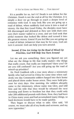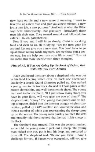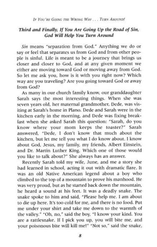 Recently I attended a meeting that was held in the Worthington Hotel in downtown Fort Worth, Texas. As I checked out of the hotel, I asked the desk clerk, “What is the best way to get out of downtown Fort Worth and back to the interstate highway?” The clerk said, “That’s easy. We are at the corner of Houston Avenue and Second Street. You will come out of the parking garage onto Houston Avenue. Turn right on Houston, go down to 6th Street and turn left, and it will take you right to I-35.” I did exactly what he said. I came out of the parking garage, turned right on Houston, went down four blocks to 6th Street, and turned left, and sure enough, I could see I-35 just ahead of me. I headed straight toward it. I drove just a short way and saw a ramp connected to I-35. I went up the ramp, rounded a curve, and you wouldn’t believe what I saw. The ramp had three lanes, and painted on the three lanes were three bold arrows—and all three of those arrows were pointing straight at me! Quickly I realized that not only was I going the wrong way on a one-way street, but even worse, I was going up the off ramp of I-35, one of the busiest interstate highways in the known world! Well, I did what anyone in his right mind would have done: I made the fastest U-turn in the history of the world. A.J. Foyt, Jeff Gordon, and Mario Andretti would have been proud of that U-turn. I found out later that the hotel desk clerk had meant to say “5th Street” rather than “6th Street.” But the point is clear. When you are going the wrong way, when you are going a dangerous way, a destructive way, a potentially deadly way, there is only one thing to do: Make a U-turn as fast as you can!            This is true not only on the streets and highways of America. It also is true on the spiritual and moral roads of life. And the good news is this: With God, U-turns are allowed! God permits U-turns! God enables and empowers U-turns! There are some situations in life that call for a U-turn; nothing else will work.