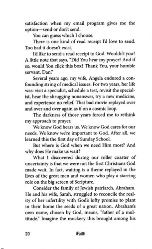 We re a generation raised on instant: Instant formula. Disposable diapers. Satellite TV. GPS navigation. Online check-in. Automatic everything. We re always plugged in and wired. We re accustomed to having answers at the snap of our fingers. We re used to being in control.How does this affect our communication with God? This is the question iFaith seeks to answer. What has life at warp speed done to our souls? Has faith been replaced with a false sense of security? Has the digital and technological revolution made us more impatient with the God who delights in making His people wait?iFaith is a unique look at prayer and faith in the twenty-first century, calling us back to a place of rest and silence and peace with God.
