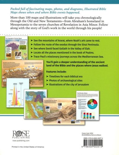 Packed full of fascinating maps, photos, and diagrams, Illustrated Bible Maps shows when and where Bible events happened. More than 100 Bible maps and illustrations will take you chronologically through the Old and New Testaments–from Abraham’s homeland in Mesopotamia to the seven churches of Revelation in Asia Minor.See the mountains of Ararat where Noah’s ark came to rest.Follow the route of the exodus through the Sinai Peninsula.See where David faced Goliath in the Valley of Elah.Locate all the places mentioned in the book of Psalms.Trace Paul’s missionary journeys across the Mediterranean Sea.You’ll gain a deeper understanding the ancient world of the Bible, with maps showing the rise and fall of empires like Assyria, Babylon, and Persia. Beautiful photos of the Holy Land will help you see where Jesus walked. Each chapter includes a concise timeline of the biblical time period so you can follow along with the big story of God’s work in the world through his people.