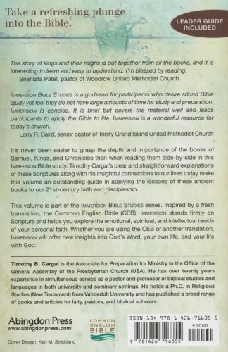It’s never been easier to grasp the depth and importance of the books of Samuel, Kings, and Chronicles than when reading them side-by-side in this Immersion Bible study. Timothy Cargal’s clear and straightforward explanations of these Scriptures along with his insightful connections to our lives today make this volume an outstanding guide in applying the lessons of these ancient books to our 21st-century faith and discipleship. Immersion, inspired by a fresh translation—the Common English Bible—stands firmly on Scripture and helps readers explore the emotional, spiritual, and intellectual needs of their personal faith. More importantly, they’ll be able to discover God’s revelation through readings and reflections.