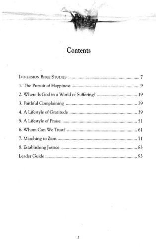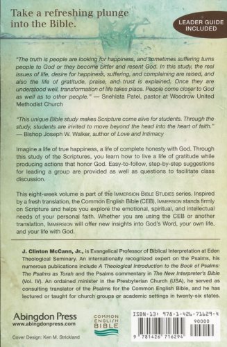 Imagine a life of true happiness, a life of complete honesty with God. Through this study of the Scriptures, you learn how to live a life of gratitude while producing actions that honor God. Easy-to-follow, step-by-step suggestions for leading a group are provided as well as questions to facilitate class discussion. This eight-week volume is part of the Immersion Bible Studies series. Inspired by a fresh translation, the Common English Bible (CEB), Immersion stands firmly on Scripture and helps you explore the emotional, spiritual, and intellectual needs of your personal faith. Whether you are using the CEB or another translation, Immersion will offer new insights into God’s Word, your own life, and your life with God. Psalms features eight sessions.