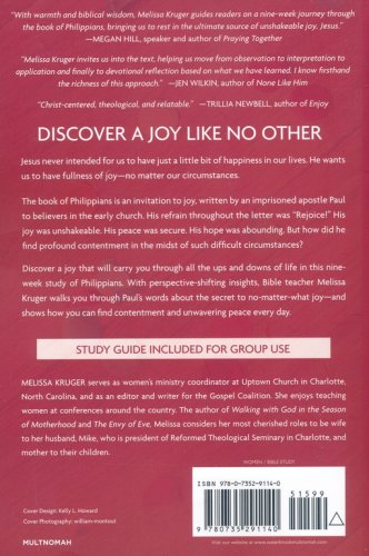 With warm teaching and perspective-shifting insights, Bible teacher Melissa Kruger walks you through the power-packed words of the apostle Paul to believers in the early church to discover what he knew about the secret to unshakeable peace–and how his insights can help any woman discover a secure and satisfying contentment no matter what life may bring. With the Scripture passages printed right in the book for handy reference, this is an ideal resource for busy women of any life stage who want to deepen their spiritual life and increase their daily joy.