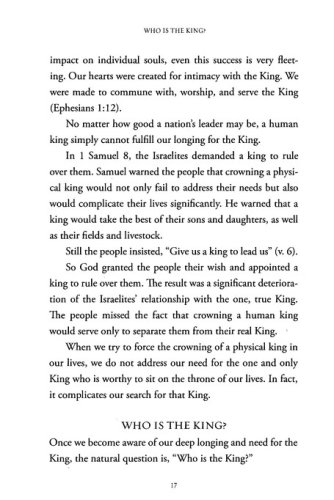 Not since C.S. Lewis has a writer so accurately and empathetically described our human condition—our deep longing for meaning and purpose. Lewis himself called it "the long terrible story of man trying to find something other than God which will make him happy." With fresh insight and authenticity, Thann Bennett invites you to join him on the journey of discovering the one true King. Thann weaves biblical application with personal illustration in a compelling call to action. Bound to be a timeless classic, you will come away knowing your true purpose—intimacy with and service to the King that will echo beyond your years.