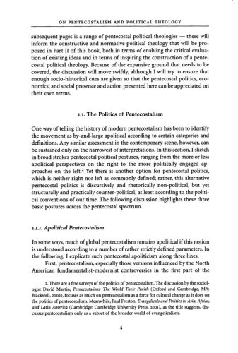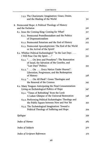 Yong has three goals here. First he seeks to correct stereotypes of Pentecostalism, both political and theological. Secondly he aims to provoke Pentecostals to reflect theologically from out of the depths of their own Pentecostalism rather than merely to adopt some framework for theological or political self-understanding. Finally Yong shows that a distinctively Pentecostal form of theological reflection is not a parochial activity but has constructive potential to illuminate Christian belief and practice.