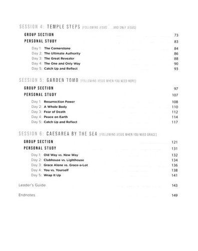 Capernaum: Following Jesus When You Doubt (20:00)Sea of Galilee: Following Jesus in Your Storms (20:00)Mount of Beatitudes: Following Jesus When You Worry (21:00)Temple Steps: Following Jesus…And Only Jesus (20:00)Garden Tomb: Following Jesus When You Need Hope (20:30)Caesarea by the Sea: Following Jesus When You Need Grace (21:00)