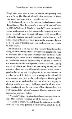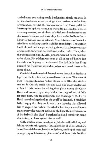 Cassidy Ivanoff and her father, John, work at the new and prestigious Curry Hotel outside Mt. McKinley. While John will be expedition and wilderness exploration guide for the wealthy tourists, Cassidy has signed on as a cook's assistant. Both are busy as the hotel prepares to welcome the president of the United States on his way to drive in the golden spike to officially complete the railroad.