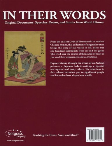 In Their Words: Original Documents, Speeches, Poems, and Stories from World History is a collection of primary works collected to use along with the Notgrass Company Exploring World History curriculum. Covering creation to the present day, this book contains traditional Maori stories, excerpts from Josephus and Aquinas, selections from Herodotus and The Odyssey, The Edict of Milan by Constantine and Licinius, Luther's 95 Thesis, "God Moves in a Mysterious Way" by Cowper, "Mr. Gorbachev, Tear Down This Wall!," the Declaration of Establishment of State of Israel, and more.