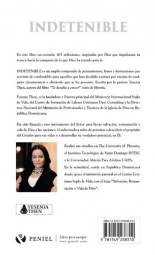 In this book you will find 365 reflections, inspired by God that will drive your progress towards the conquest of what God has designed for you. Indetenible is a wide compendium of thoughts, phrases and illustrations that will serve as fuel for those who have decided to advance above any circumstance and obstacle that may present themselves. Written by Pastor Yesenia Then, author of the book "I Challenge You to Grow", a bookstore hit.