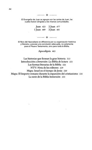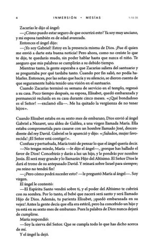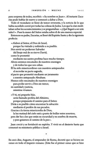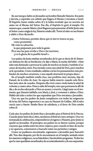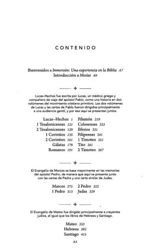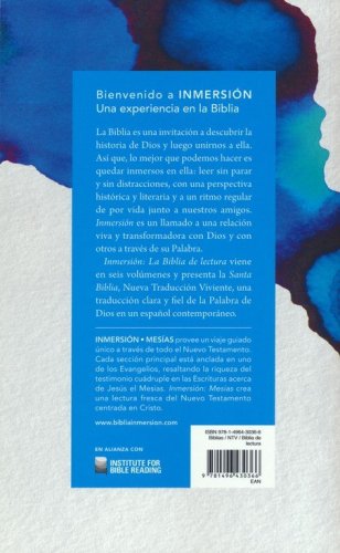 Mesías [Messiah], the first of six volumes in the Inmersión [Immerse] series, takes the reader on a new and unique journey through every book of the New Testament. The Inmersión series provides a new way to interact with God's Word because it delivers Scripture to the reader as it was originally created: without chapter or verse breaks. While references are available for ease of finding specific Scripture references, those references do not appear within the actual text of Scripture. This makes for uninterrupted reading of God's Word. The result is a Bible developed for being read and understood, not referred to. Created with the look and feel of a paperback book, and written using the text of the Nueva Traducción Viviente, the most readable Spanish translation available, Mesías enables you to easily read and understand the New Testament.