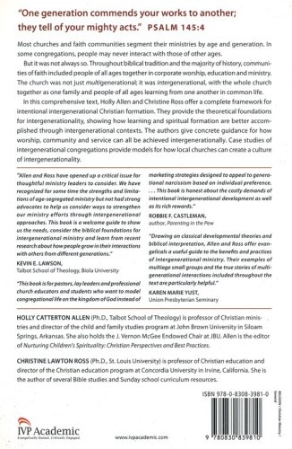 "One generation commends your works to another; they tell of your mighty acts." —Psalm 145:4 Most churches and faith communities segment their ministries by age and generation. The kids go to children’s church, the teens go to youth group. Worship services are geared toward different generational preferences, and small groups gather people at the same life stage, whether singles, young marrieds, parents, or empty nesters. In some congregations, people may never interact with those of other ages. But it was not always so. Throughout biblical tradition and the majority of history, communities of faith included people of all ages together in corporate worship, education, and ministry. The church was not just multigenerational; it was intergenerational, with the whole church together as one family and people of all ages learning from one another in common life. In this comprehensive text, Holly Allen and Christine Lawton offer a complete framework for intentional intergenerational Christian formation. They provide the theoretical foundations for intergenerationality, showing how learning and spiritual formation are better accomplished through intergenerational contexts. It is not just elders teaching youth; learning also takes place when adults discover fresh insights from children. Then the authors give concrete guidance for intergenerational praxis on how worship, learning, community, and service can all be achieved intergenerationally. Case studies of intergenerational congregations provide models for how a culture of intergenerationality can be created in local churches. This volume serves as an essential guide for all preparing for and involved in congregational ministry and formation. Discover the riches of intergenerational ministry, and let all generations commend the works of God to one another.