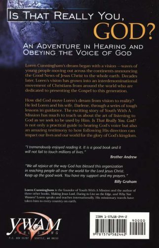 "Loren Cunningham's dream began with a vision–waves of young people moving out across the continents announcing the Good News of Jesus Christ. Decades later, Loren's vision has grown into an interdenominational movement of Christians from around the world who are dedicated to presenting the gospel to this generation. Loren speaks and teaches internationally, and his missionary travels have taken him to every nation on earth. The exciting story of Youth With A Mission has much to teach us about the art of listening to God as we seek to be used by Him. "Is That Really You, God? is not only a practical guide to hearing God's voice but also an amazing testimony to how following His direction can impact our lives and the world for the glory of God's kingdom.