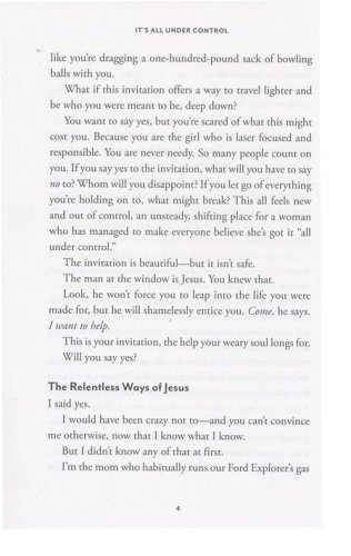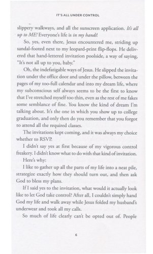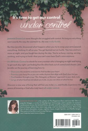 It's time to get our control under control.Jennifer Dukes Lee never thought she struggled with control. As long as everything went exactly the way she wanted it to, she was totally flexible.But then Jennifer discovered what happens when you try to wrap your arms around everything, thinking it's all on you: You get burned out on hustle. You toss and turn more at night, and you laugh less during the day. You're so busy-caring, serving, working, and trying so hard-that you can't even hear God's voice anymore.It's All Under Control is a book for every woman who is hanging on tight and trying to get each day right-yet finding that life often feels out of control and chaotic. Join Jennifer on the journey of learning how to:Overcome the anxieties and worries that burden your heartPrioritize your busy life so you can make choices that align with God's best for youFind freedom through a new "Do, Delegate, or Dismiss" approach to your daily tasksLet go of what God has not asked you to do, so you can shine at what he hasDiscover a new way of living that will free you to be you, and finally experience the peace of knowing a God who truly has it all under control.