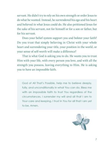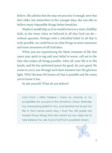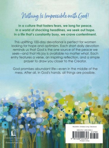 100 devotions focused on possibility, hope, and faithScripture verses and heartfelt prayersReflections for deeper connectionReadings for people encountering disappointment and discouragement, such as Believe the Impossible, It’s a New Day, and Abundant Life