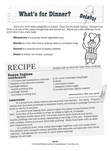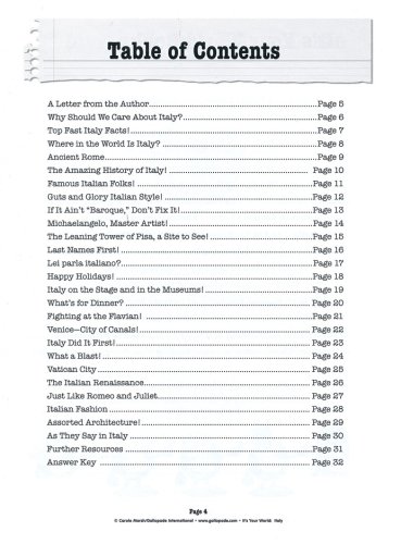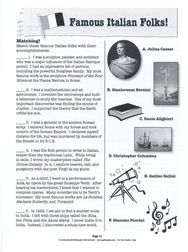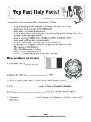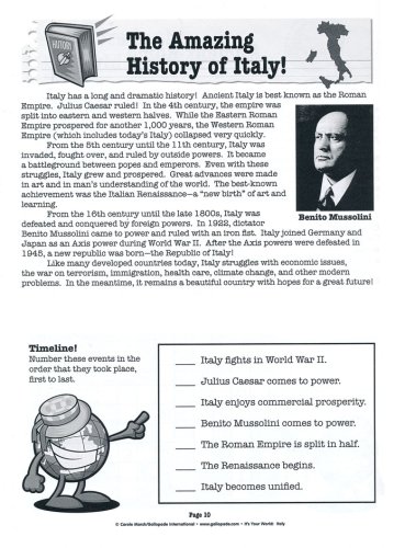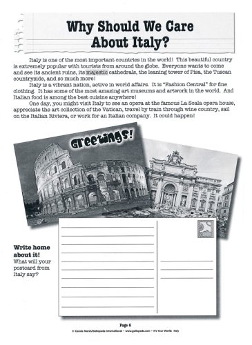 Kids will enjoy learning about Italy, including what language is spoken, what foods are enjoyed, the history of the country, Italian culture, and more. Fun activities include writing activities, completing puzzles and questions based on informative lesson passages, hands-on ideas, and more. Perfect for integrating world geography into social studies curriculum! 32 reproducible pages, softcover; answer key included. Aligned to Common Core standards. Recommended for Grades 3-6.