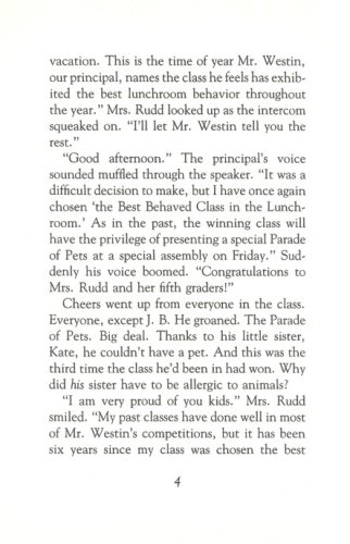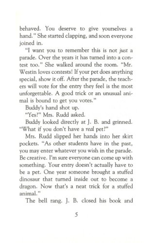 In J.B. Wigglebottom and the Parade of Pets, J.B.'s class wins a prize of being the best behaved class in the school. The prize is that the class can bring in their pets and have a pet parade. But J.B. can't have a pet because of his little sister Kate, so he decides to think outside the box to find his own cool and totally unique pet!