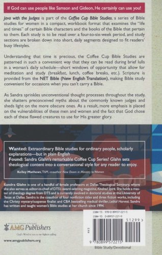 Java with the Judges is part of the Coffee Cup Bible Studies, a series of Bible studies for women in compact, workbook format that examine the "life and times" of certain Bible characters and the books of the Bible that pertain to them. Each study is to be read over a four-to-six week period, and study sections are broken down into short, daily segments designed to fit reader's busy lifestyles.Understanding that time is precious, the Coffee Cup Bible Studies are patterned in such a convenient way that they can be read during brief windows of opportunity that allow for meditation and study (breakfast, lunch, coffee breaks, etc.). Scripture is provided from the NET Bible (New English Translation). making Bible study convenient for occasions when you can't carry a Bible.As Sandra sprinkles unconventional thought processes throughout the study, she shatters preconceived myths about the commonly known judges and sheds light on the more obscure ones. As a result, more emphasis is placed on the vulnerabilities of these men and women and the fact that God chose each of these flawed creatures to use for His greater glory.