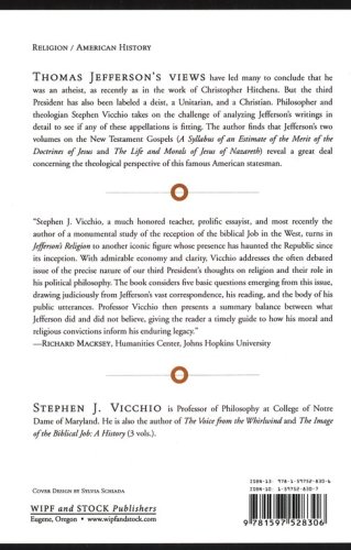Thomas Jefferson's views have led many to conclude that he was an atheist, as recently as in the work of Christopher Hitchens. But the third President has also been labeled a deist, a Unitarian, and a Christian. Philosopher and theologian Stephen Vicchio takes on the challenge of analyzing Jefferson's writings in detail to see if any of these appellations is fitting. The author finds that Jefferson's two volumes on the New Testament Gospels (A Syllabus of an Estimate of the Merit of the Doctrines of Jesus and The Life and Morals of Jesus of Nazareth) reveal a great deal concerning the theological perspective of this famous American statesman.