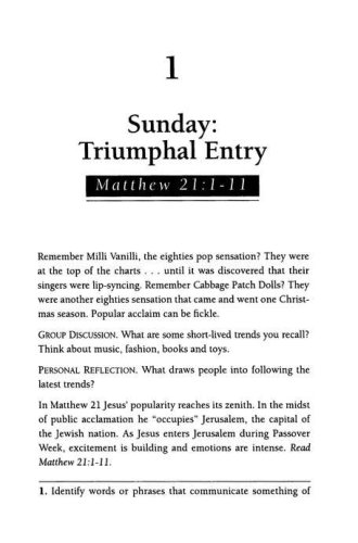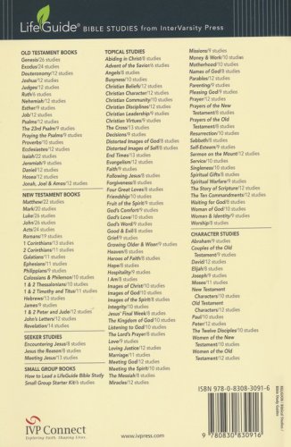 The events that took place during Jesus' final week on earth–Palm Sunday, the Last Supper, the trial, Jesus' death and his resurrection–are foundational to your salvation and your Christian life. As these session LifeGuide ® Bible Study allow you to focus more closely on these amazing events, you'll gain new understanding about who Jesus is and how he loves you. This eight-session LifeGuide Bible Study features questions for starting group discussions and for meeting God in personal reflection. Leader's notes are included with information on study preparation, leading the study and small group components as well as helps for specific Bible passages covered in the study. Presented in a convenient workbook format and featuring the inductive Bible study approach, LifeGuides are thoroughly field-tested prior to publication; they're proven and popular guides for digging into Scripture on your own or with a small group. For over three decades LifeGuide Bible Studies have provided solid biblical content and raised thought-provoking questions—making for a one-of-a-kind Bible study experience for individuals and groups. This series has more than 130 titles on Old and New Testament books, character studies, and topical studies.