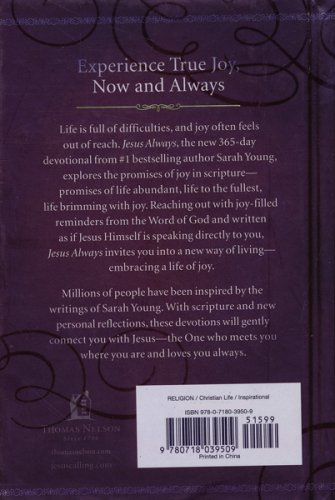 If you love Jesus Calling, you'll enjoy Jesus Always. With Scripture and personal reflections, the #1 New York Times bestselling author Sarah Young brings Jesus' message of joy today and every day with this 365-day devotional.