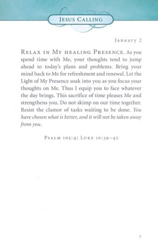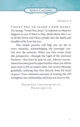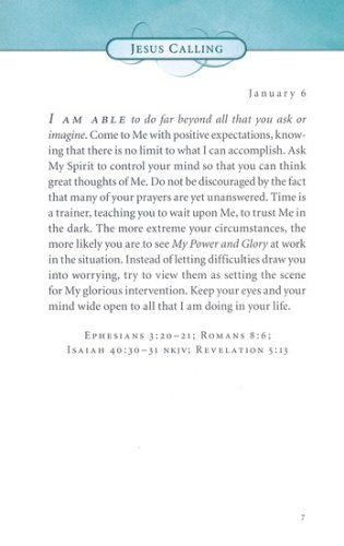 This edition is sure to be a favorite in the popular Jesus Calling® line. The fashionable teal color in deluxe leathersoft format has feminine floral touches, giving a gorgeous, elegant feel that will appeal to women to purchase for themselves or for all their friends.