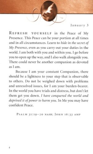 In these powerful pages are the words and Scriptures Jesus lovingly laid on her heart. Words of reassurance, comfort, and hope. Words that have made her increasingly aware of His presence and allowed her to enjoy His peace.