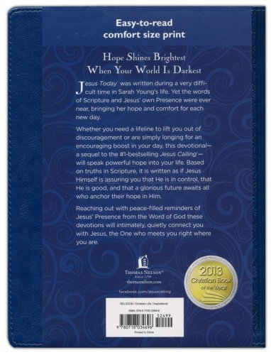 This new edition of Jesus Today®, the 2013 ECPA Christian Book of the Year, makes bestselling content available to enjoy in a beautiful, large leathersoft format. Jesus Today® was written during a very difficult time in Sarah Young's life. Yet the words of Scripture and Jesus' own Presence were ever near, bringing her hope and comfort for each new day. The theme of the book is hope. Hope shines brightest when our world is darkest. This book is for you if you are feeling insecure or anxious about the conditions around them; hopeless because of problems; helpless due to a lost job, home, or loved one; or who want to start the day with a fresh sense of encouragement. Jesus Today® includes 50 quotations about hope from the Bible and from respected Christian authors to provide a "hope boost." Scripture index included. Now in a large format, with easy-to-read text and a beautiful leathersoft cover.