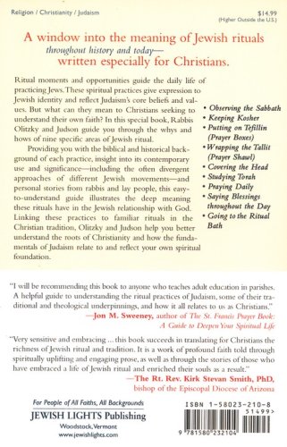 Ritual moments and opportunities guide the daily life of practicing Jews. These spiritual practices give expression to Jewish identity and reflect Judaism's core beliefs and values. But what can they mean to Christians seeking to understand their own faith? In this special book, Rabbis Olitzky and Judson guide you through the whys and hows of nine specific areas of Jewish ritual. Providing you with the biblical and historical background of each practice, insight into its contemporary use and signifigance – including the often divergent approaches of different Jewish movements – and personal stories from rabbis and lay people, ths easy-to-understand guide illustrates the deep meaning these rituals have in the Jewish relationship with God. Linking these practices to familiar rituals in the Christian tradition, Olitzky and Judson help you better understand the roots of Christianity and how the fundamentals of Judaism relate to and reflect your own spiritual foundation.