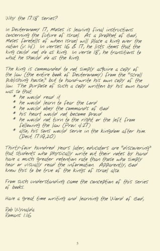 In Deuteronomy 17, Moses is leaving final instructions concerning the future of Israel. As a prophet of God, Moses foretells of when Israel will place a king over the nation (v. 14). In verse 18, the king is commanded to not simply acquire a copy of the law (the entire book of Deuteronomy) from the “scroll publishing house,” but to hand write his own copy of the law. Thirty-four hundred years later, educators are “discovering” that students that physically write out their notes by hand have a much greater retention rate than simply hearing or visually reading the information. Apparently, God knew this to be true of the kings of Israel also. From such understanding came the conception of this series of books.