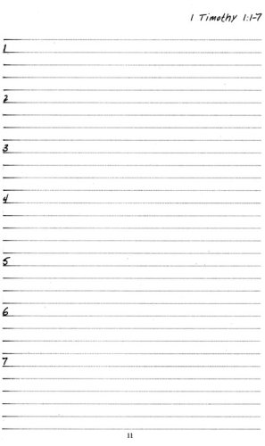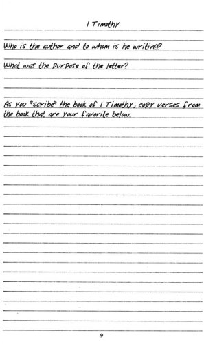 Each book is organized so that you can write out your very own copy of Scripture. You will be writing the Bible text only on the right-hand page of the book. This should make for easier writing and allows ample space on the left page to write your own notes and comments. From time to time a question or word will be lightly printed on the left page; these questions are to aid in further study but should not interfere with your own notes and comments.
