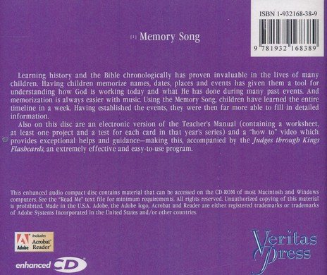 This homeschool teacher's manual enhanced CD is part of the Veritas Press Bible Series Judges through Kings. It includes not only the Judges through Kings timeline memory song, but also an electronic version of the Teacher's Manual (which includes a worksheet, at least one project, and a test for each card in that year's series) and a "how to" video which provides helps and guidance. Enhanced materials are in adobe acrobat format and can be accessed on the CD-ROM of most Macintosh and Windows computers. Grade 3.