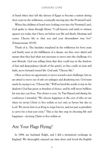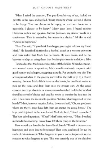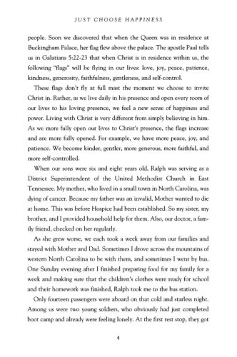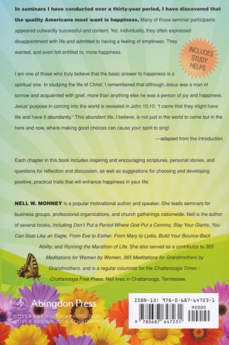 Nell W. Mohney, adapted from the Introduction: "In seminars I have conducted over a thirty-year period, I have discovered that the quality most wanted by Americans is happiness. Many of those seminar participants drove to the seminars in luxury cars, and they looked well fed and well dressed. Yet, individually, they often expressed disappointment with life and admitted to having a feeling of emptiness. They wanted, and even felt entitled to, more happiness.… I am one of those who truly believe that the basic answer to happiness is a spiritual one. We are made for God, and as Saint Augustine said, “Our hearts are restless ‘til they rest in thee.” All parts of our personalities are drawn to wholeness and happiness when Christ is resident within. In studying the life of Christ, I remembered that although Jesus was a man of sorrow and acquainted with grief, more than anything else he was a person of joy and happiness.… Even his purpose in coming into the world is revealed in John 10:10: “I came that they might have life and have it abundantly.” This abundant life, I believe, is not just in the world to come but in the here and now, where a series of committed choices can cause your spirit to sing."