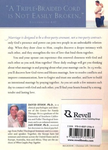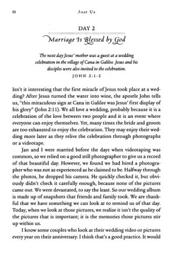 Marriages have a better opportunity of thriving when couples spend time together with God. In Just Us, David and Jan Stoop provide just what couples need to make the most of the precious time they spend together seeking God. Each week's devotions revolve around a specific theme. In just a few minutes each day, couples will focus on God's view of marriage, how God blesses marriage, how to grow in love and intimacy, faithfulness, improving communication, resolving conflicts, the roles of husband and wife, building trust, forgiveness, the importance of prayer, and how to have an intentional marriage. At the end of each devotion, couples will enjoy the "Talking Together" section with thought-provoking questions for the couple to discuss and further develop the theme or strengthen it in their marriage. By setting aside short daily times together each week, every couple has the opportunity to plant these themes deeper into their lives. What a gift for couples!