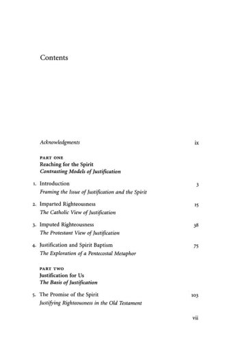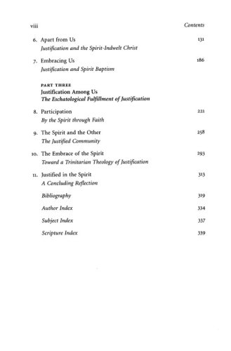Inspired by the typically Pentecostal accent on the indwelling of the Holy Spirit, Justified in the Spirit sets both Protestant and Catholic views within a larger framework, namely, the Spirit of Life as the realm of God's favor. Since the Holy Spirit is the power of love and communion within the Trinity and between us and God, a pneumatological accent ultimately locates the justification of the sinner within the embrace of the Triune God as a communion of persons. Therefore, the Christological, ecclesiological, social, and ecological implications of justification can be fruitfully developed from the broad spaces of this Trinitarian communion.