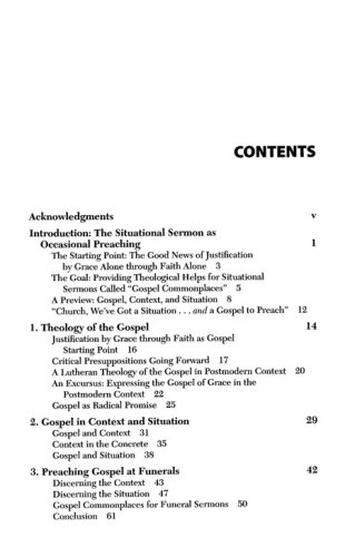 Sometimes lectionary preachers struggle when situations present themselves in parish life. A congregational member dies, two lives are joined in marriage, a contentious social justice issue demands attention, or a public event like 9/11 shakes us to the core. Although lectionary and worship allow us to deepen our appreciation for the Bible and the themes and emphases of the Christian calendar, they sometimes fail to allow preachers to speak the gospel directly to the situations that occupy their congregations. This book is designed to help pastors and seminarians discover resources they already have to unpack situations and understand them theologically in light of their task of preaching the gospel.