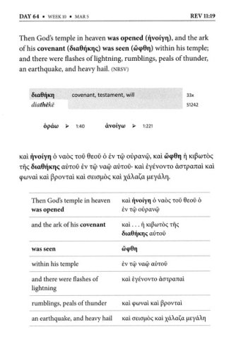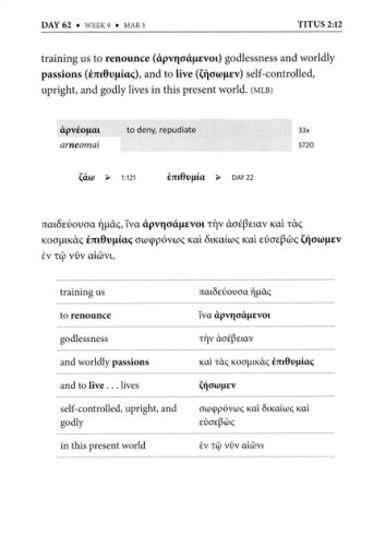 Like its predecessor volume, Keep Up Your Biblical Greek in Two Minutes a Day: Volume 1, this book does not replace the need for a grammar or textbook; rather, it complements grammatical study by helping you to build a robust vocabulary and to review morphology and syntax in a completely inductive way, and without using any grammatical jargon. While volume 1 helps you review the 365 most common words in the New Testament, volume 2 focuses on the next most frequently occurring group of 365 words (those that occur between 41 and 16 times in the New Testament), likewise presenting these words one day at a time in order of descending frequency, and in the context of verses in which they appear. The structure and daily components found in volume 2 are identical to those of volume 1 and thus will be immediately familiar to anyone who has used that book.